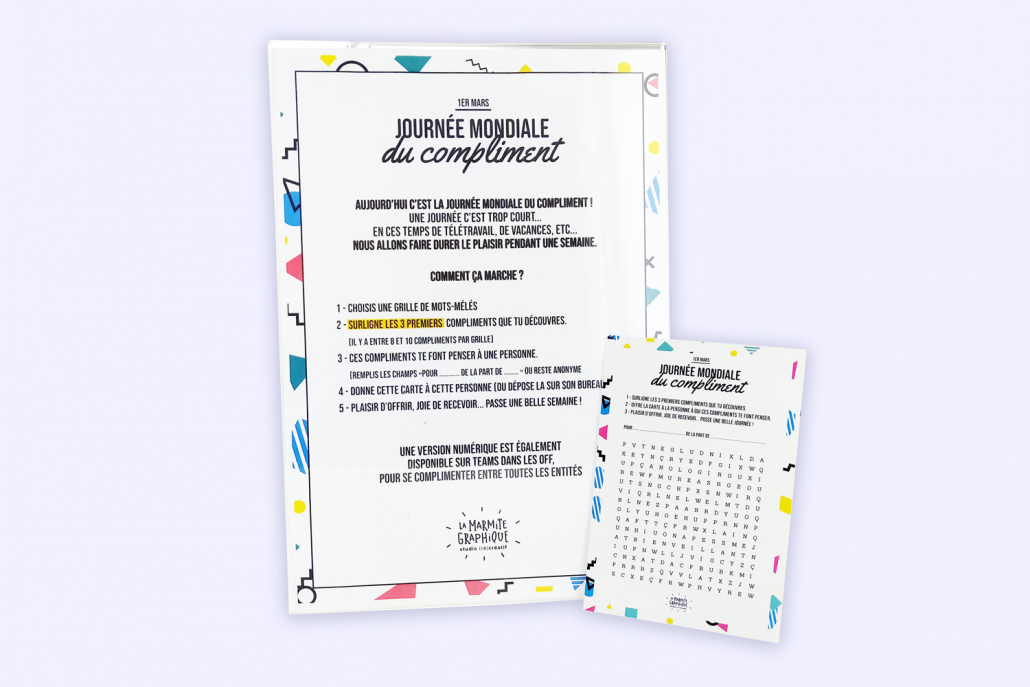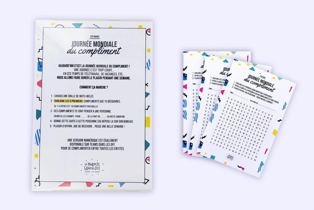 La cohésion d’équipe étant au cœur de notre projet, nous avons eu l’idée de proposer un kit pour animer cette journée. Il répond à un besoin humain que nous souhaitons valoriser : pour nous sentir bien, il nous faut de la reconnaissance, des compliments.