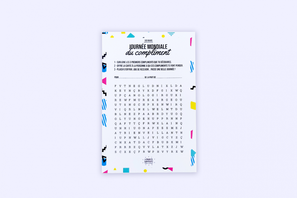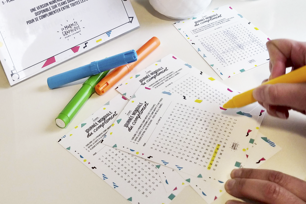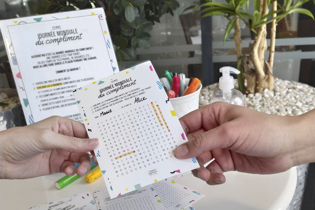 Alors, joueurs que nous sommes, nous avons imaginé une série de grilles de mots-mêlés dans lesquelles se cachent des compliments. Au-delà de l’action de complimenter ses collègues (ça fonctionne aussi avec la famille, les amis, les élèves…), ce jeu nous pousse à aller vers des personnes que nous connaissons plus ou moins. En effet, c’est une fois que l’on a dénicher les adjectifs qu’il faut trouver la personne qui les porte le mieux.